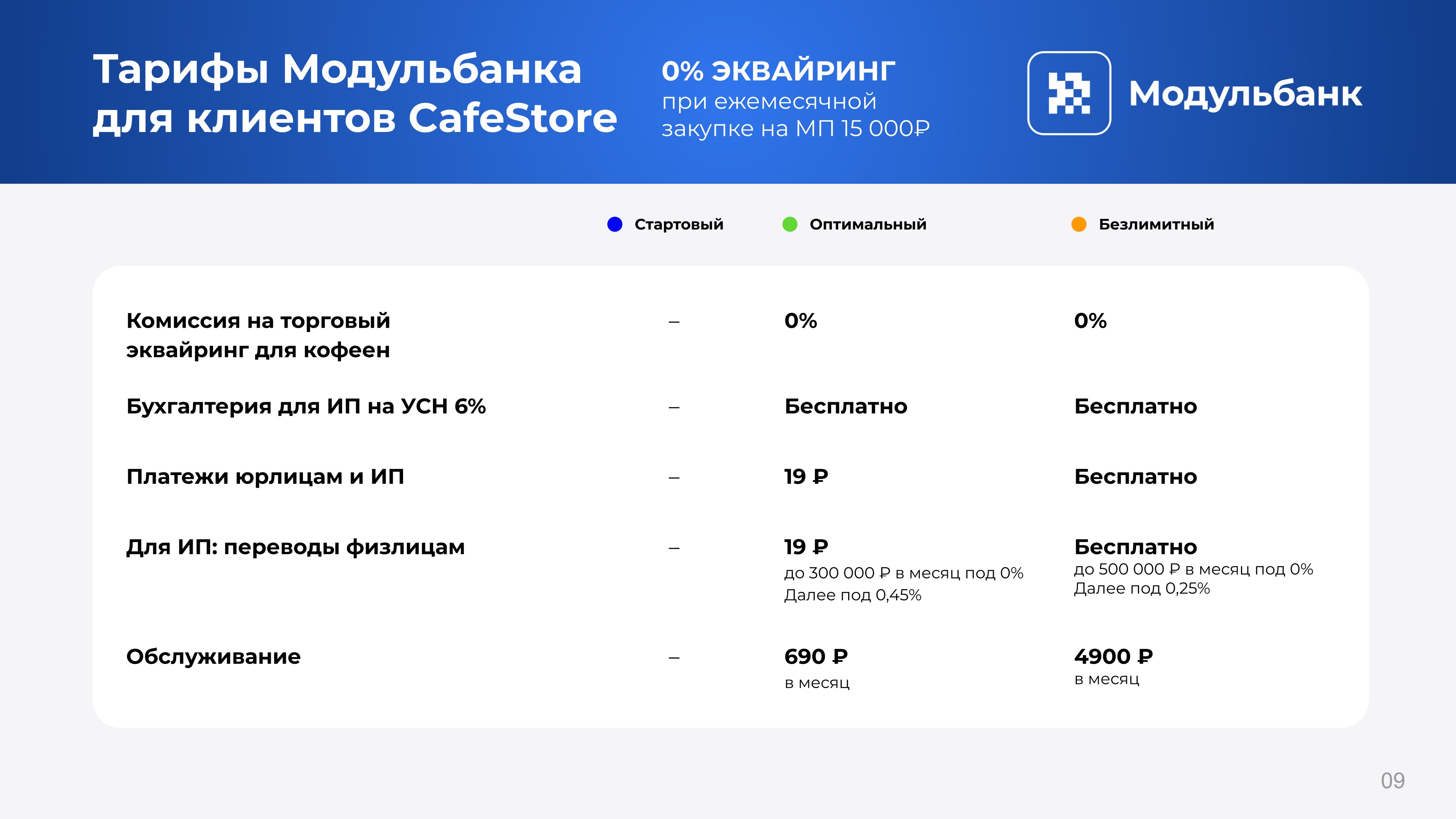 Оплата возможна постфактум — отсрочка платежа до 21 дня. CafeStore - это еще и банк с удобными тарифами для расчетов с поставщиками.