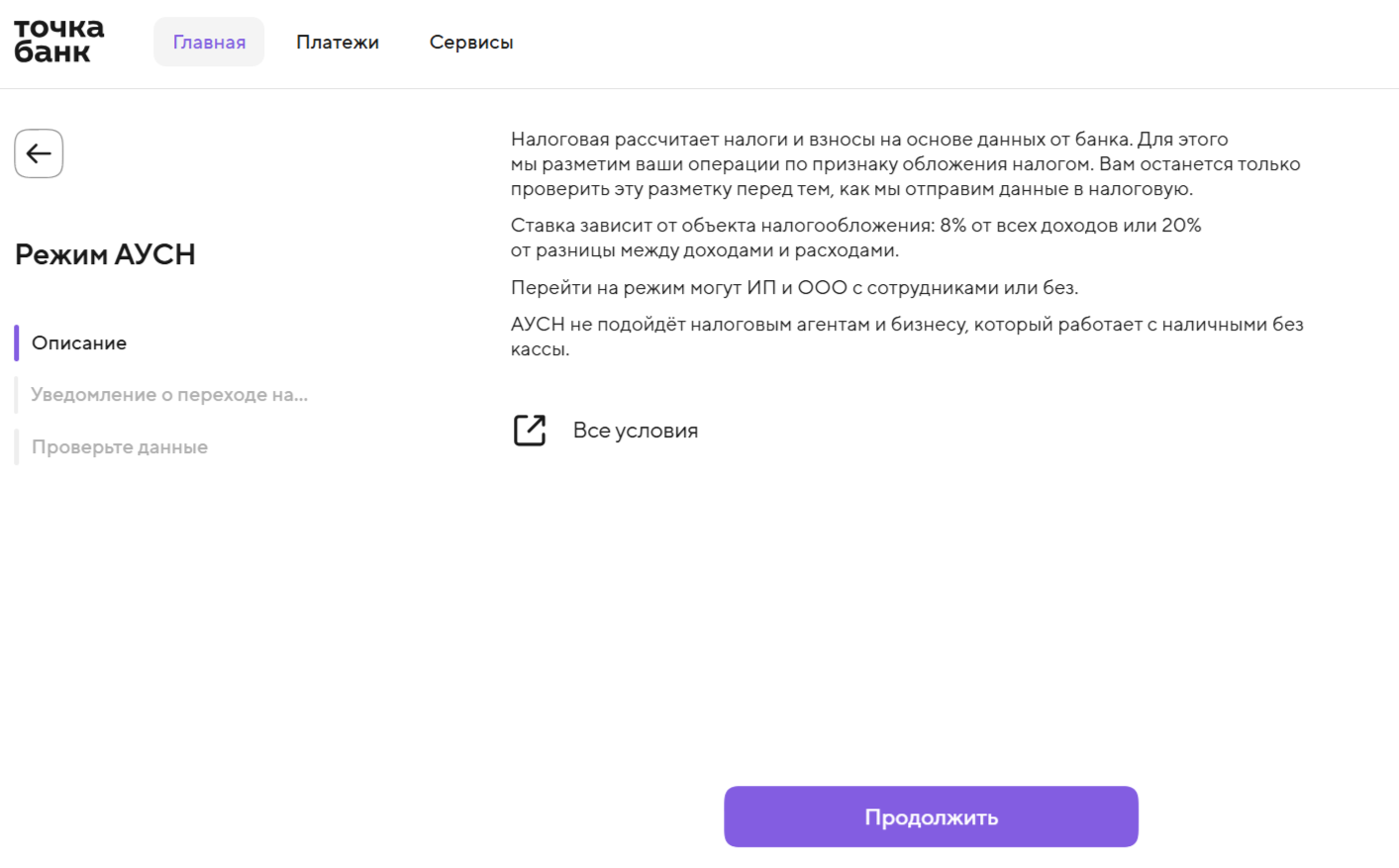 Ознакомьтесь со всеми условиями применения АУСН. Это можно сделать в Онлайн-бухгалтерии или на сайте налоговой Если АУСН вам подходит, нажимайте «Продолжить» |